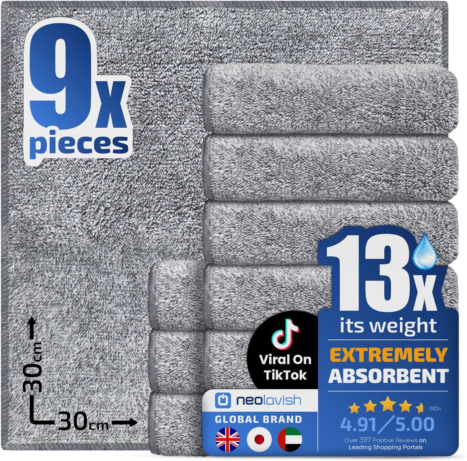 - بسته ۹ عددی حوله آشپزخانه: شامل ۶ عدد حوله ظرفشویی میکروفایبر خاکستری با اندازه ۳۰ × ۳۰ سانتیمتر؛ برای خشک کردن و براق کردن در آشپزخانه؛ دستمالهای تمیزکاری ضخیم برای نگهداری مرتب در کشو و یکی برای آماده نگه داشتن در هر فضای آمادهسازی