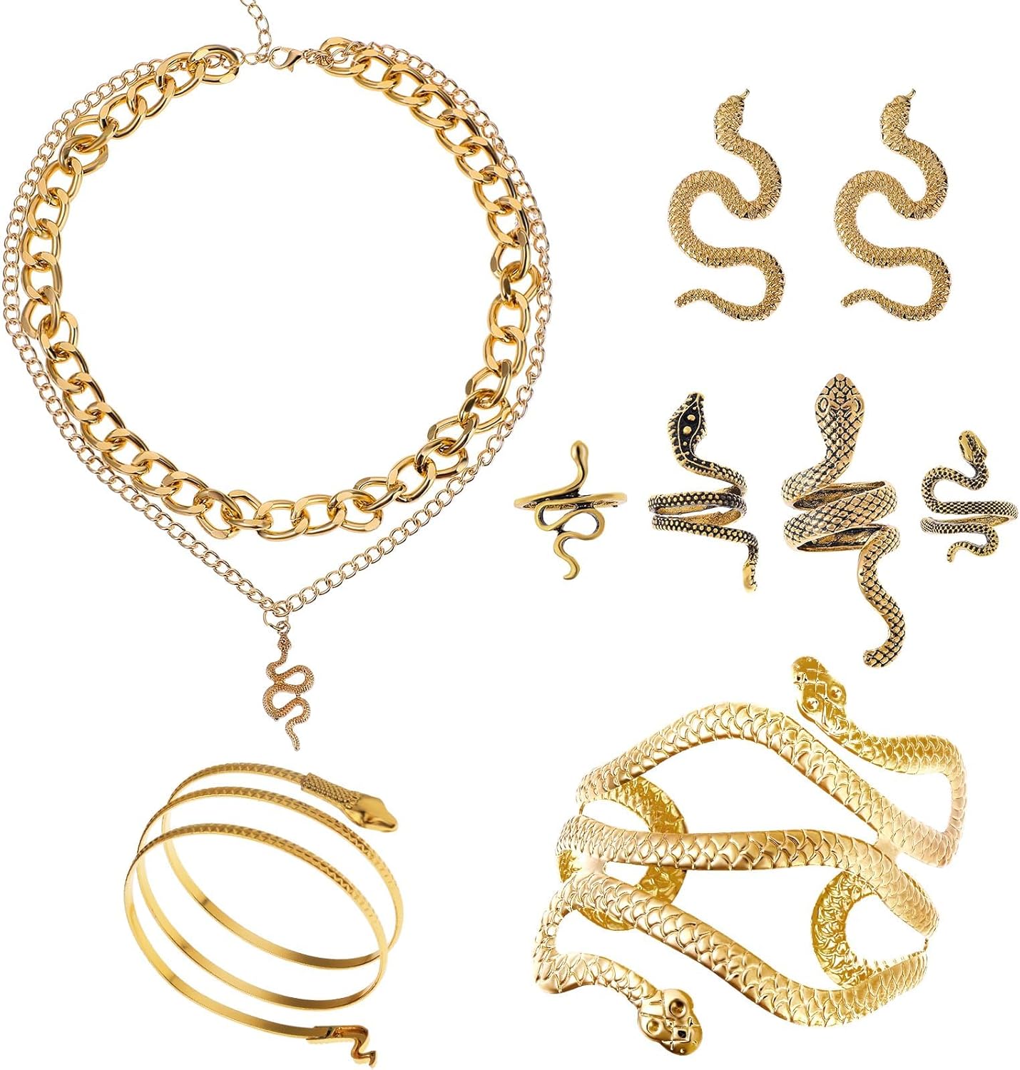 - 🐍Package Includes: The package will provide you with 8 pieces of snake jewelry set, including 1 piece of necklace, 1 piece of bracelet, 1 piece of arm cuff, 1 pair of earrings and 4 pieces of rings.